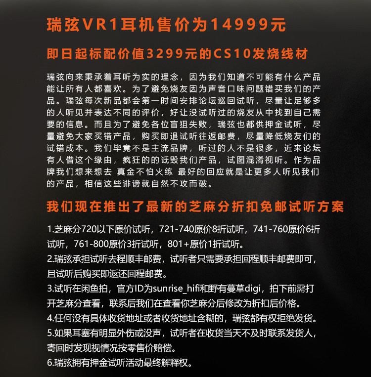 成为第一个“瑞弦陶瓷振膜入耳旗舰VR1日本VGP受赏金奖产品标配CS1线材” 的评价者